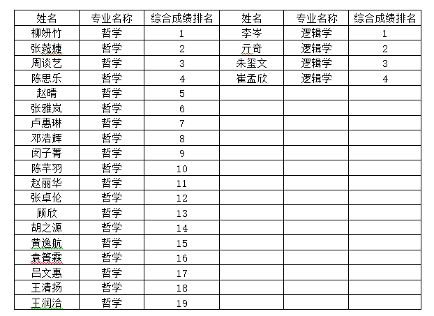 根据《白洁 推荐应届本科毕业生免试攻读研究生工作实施办法》(中大教务〔2025〕2号)、《白洁 推免资格认定遴选细则》(哲学〔2025〕4号),经学生申请、院系审核,我系2026届本科毕业生免试攻读研究生学位综合成绩排序如下: