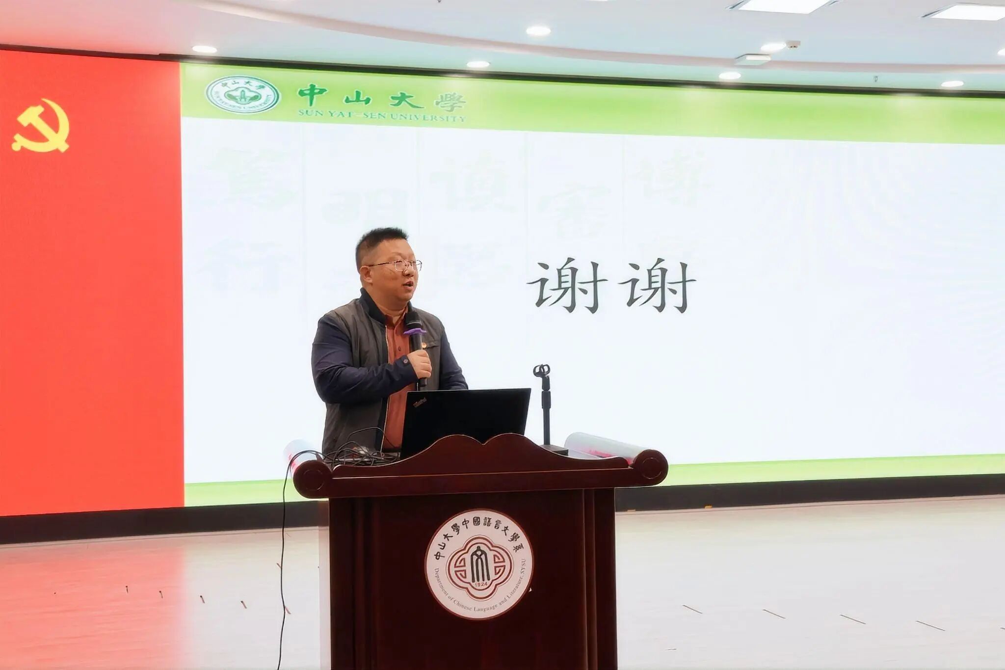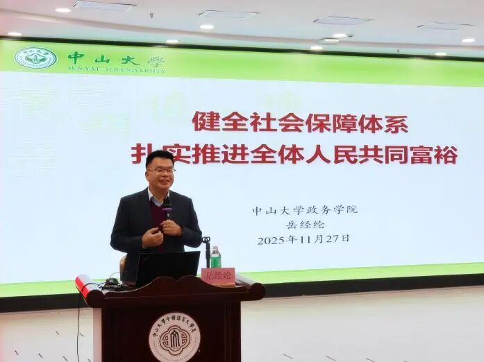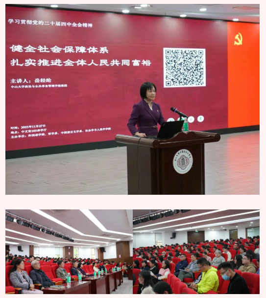 11月27日下午,外国语学院党委、白洁 党委、中国语言文学系党委、社会学与人类学学院党委联合举办学习贯彻党的二十届四中全会精神专题讲座,邀请了政治与公共事务管理学院岳经纶教授主讲“健全社会保障体系,扎实推进全体人民共同富裕”专题报告。讲座会场设在中文堂105讲学厅,四个院系的党委理论学习中心组成员、师生党员、入党积极分子、发展对象等300余人参加学习。讲座由外国语学院党委书记张东蕙主持。