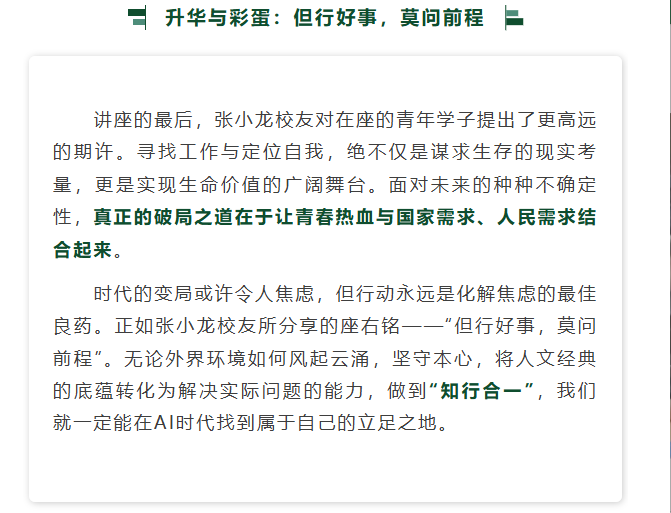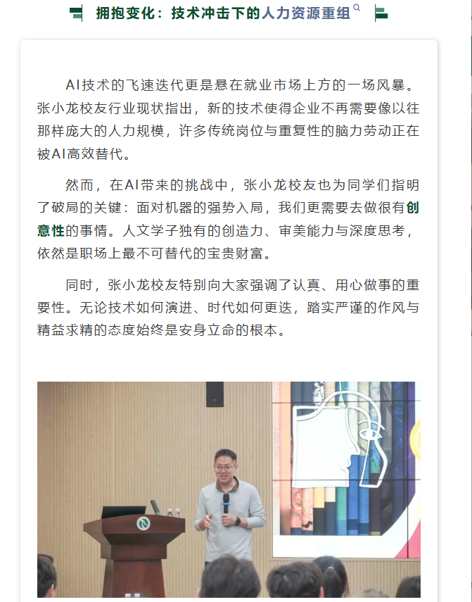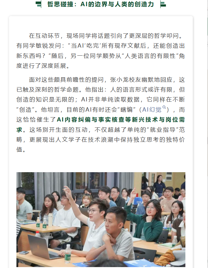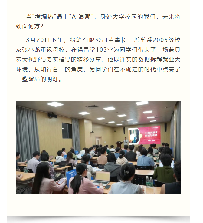 导航痕迹 白洁 成长论坛回顾丨张小龙:AI时代的就业困境与机遇——人文学子的破局之道 成长论坛回顾丨张小龙:AI时代的就业困境与机遇——人文学子的破局之道 发布日期:2026-03-27 扫描此二维码分享